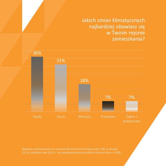 Polacy wydają się być coraz bardziej świadomi zagrożeń płynących ze zmian klimatu – wskazuje raport sopockiej pracowni PBS, który przeprowadzony został na zlecenie Multiconsult Polska. Respondenci zapytani zostali między innymi o to, których z niebezpiecznych skutków zmian klimatu obawiają się najbardziej. 36 proc. ankietowanych wskazało na szkodliwy dla człowieka wzrost temperatury, 31 proc. na susze, 18 proc. na silne wichury, zaś 7 proc. – na powodzie.