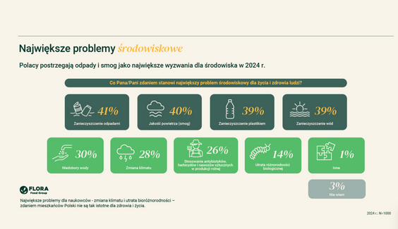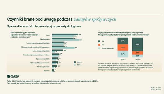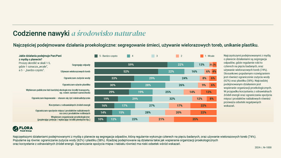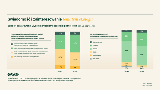Z badania Flora Food Group wynika, że najwyższy odsetek osób deklarujących wysoki poziom świadomości ekologicznej – 35 proc. – występuje w przedziale wiekowym 18–29 lat. W grupach 50–59 lat oraz powyżej 60. roku życia wynik ten wynosi zaś po 30 proc. Co może być dla niektórych zaskakujące, respondenci pochodzący ze wsi częściej niż osoby z miast powyżej 250 tys. mieszkańców wskazują, iż szczegółowo śledzą informacje dotyczące środowiska – dane wskazują na 15 proc. do 6 proc. W dużych aglomeracjach większy odsetek osób ocenia zaś swoją świadomość ekologiczną jako wysoką (34 proc.), w porównaniu do 28 proc. na wsiach. Wykształcenie także przekłada się na świadomość ekologiczną – 38 proc. ankietowanych po studiach wyższych deklaruje wysoki poziom, podczas gdy wśród osób z wykształceniem podstawowym odsetek ten wynosi 26 proc.