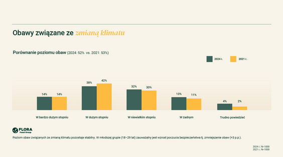 Badanie Flora Food Group, które śledzi zmiany w postawach konsumentów wobec zmiany klimatu, nie pozostawia złudzeń – od 2021 roku zaobserwowano wyraźny spadek zarówno deklarowanej świadomości ekologicznej, jak i zainteresowania zagadnieniami związanymi z ochroną środowiska. Podczas gdy w 2021 roku 44 proc. badanych oceniało swoją świadomość ekologiczną jako wysoką lub bardzo wysoką, dziś odsetek ten wynosi 29 proc. Jak zauważają autorzy badania, jednocześnie liczba osób, które przyznają, że śledzą informacje dotyczące zmiany klimatu jedynie w sposób powierzchowny, wzrosła z 35 proc. do 42 proc. 16 proc. respondentów czuje natomiast przesyt treściami klimatycznymi w mediach, co wskazuje na znudzenie tematem – takich odpowiedzi w 2021 roku było bowiem 9 proc.