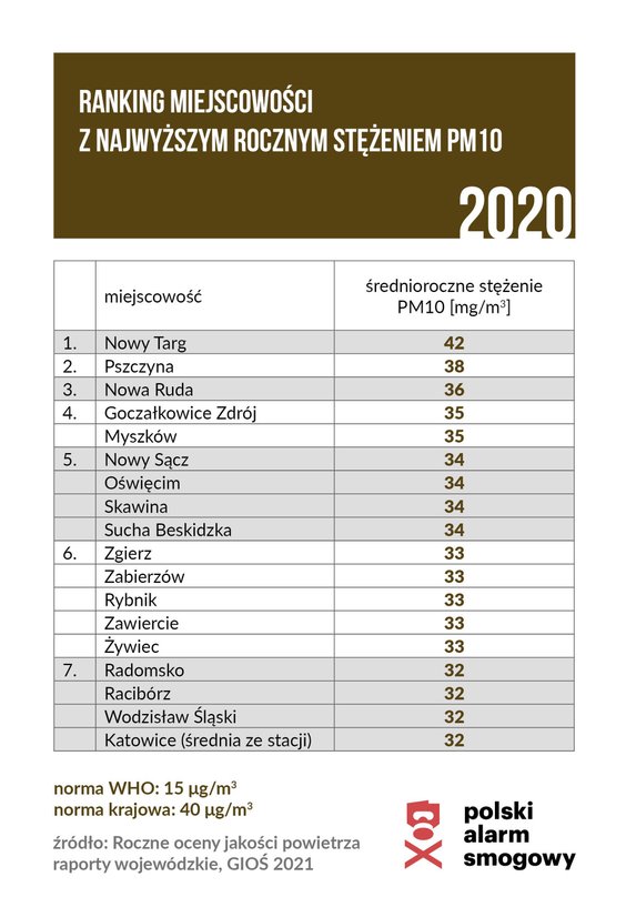 Ranking Polskiego Alarmu Smogowego tworzony jest co roku na podstawie oficjalnych wyników pomiarów ze stacji Państwowego Monitoringu Środowiska (PMŚ). Najnowszy ranking obejmuje dane z roku 2020. Co istotne, analiza dotyczy wyłącznie miejscowości, w których prowadzone są pomiary PMŚ. Nie jest znana sytuacja w pozostałych miejscowościach, lecz można przypuszczać, że również tam jakość powietrza często znacząco odbiega od obowiązujących norm.