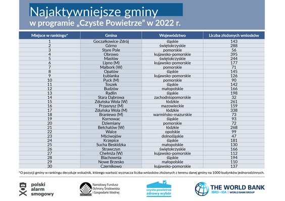 Ranking aktywności gmin w programie Czyste Powietrze za rok 2022 opublikowany dziś przez Narodowy Fundusz Ochrony Środowiska i Gospodarki Wodnej (NFOŚiGW), Polski Alarm Smogowy oraz Bank Światowy wskazuje, że niekwestionowanymi liderami pod względem liczby złożonych wniosków w programie Czyste Powietrze są gminy województwa śląskiego. W pierwszej setce najaktywniejszych gmin aż 25 pochodzi z województwa śląskiego. Na pierwszym miejscu rankingu znajduje się śląska gmina Goczałkowice-Zdrój.