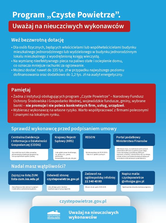 Nieuczciwe praktyki uderzają w najmniej zamożnych beneficjentów „Czystego Powietrza”, dla których przewidziano sfinansowanie nawet 100 proc. eko-inwestycji. Osoby z najtrudniejszą sytuacją materialną – przy dochodzie do 1090 zł na osobę w gospodarstwie wieloosobowym i do 1526 zł w jednoosobowym lub przy ustalonym prawie do jednej z czterech form zasiłku określonych w programie – mogą liczyć nawet na 135 tys. zł bezzwrotnej dotacji. Warunkiem jest wymiana nieefektywnego źródła ciepła na paliwo stałe na pompę ciepła wraz z wykonaną termomodernizacją oraz montażem mikroinstalacji fotowoltaicznej.